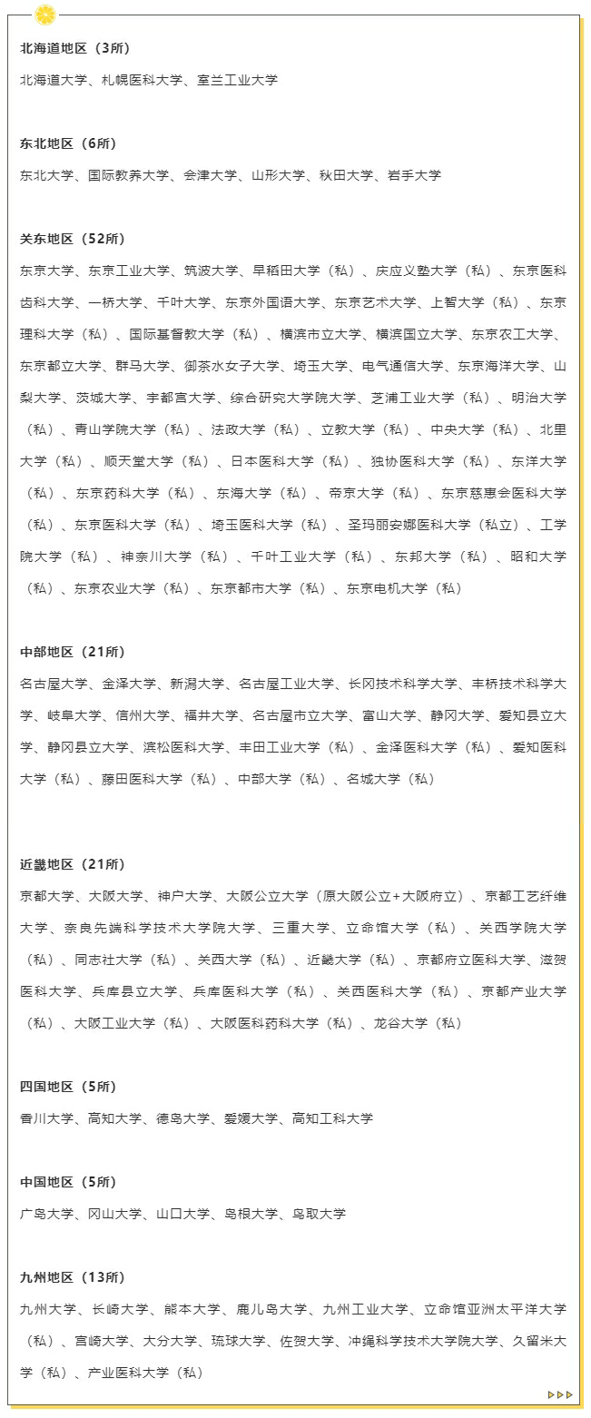 下面是日本2023年公布的加分校的具体名单,共计126所,根据8个地区来分别整理如下,国公立大学未单独备注,(私)为私立大学。