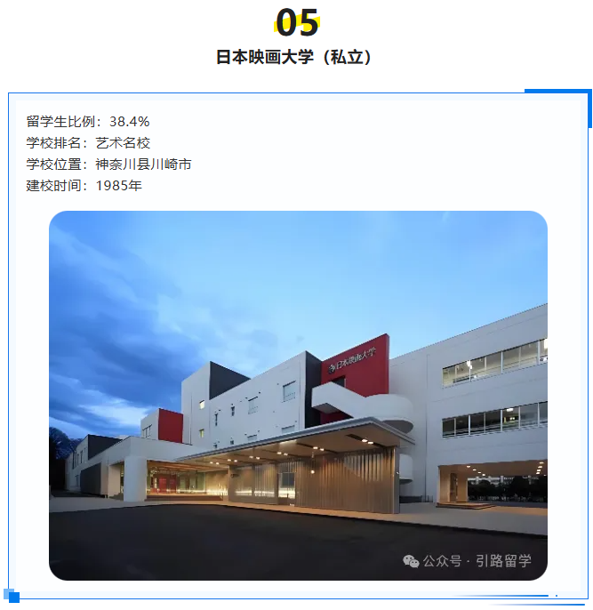 学校位置坐落在神奈川县川崎市的东京摄影所旁边,很方便去现场参观实习,开设有包括编导、脚本、摄影照明、录音、剪辑以及纪录片在内的多种电影行业课程,培养出非常多的行业人才。