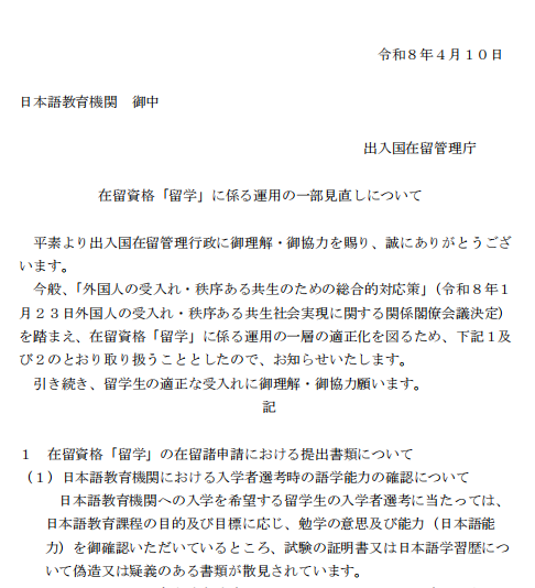 日本出入国在留管理厅,4月10日向日本各语言学校下发了一份文件,是关于申请留学资格的与资格外活动许可(兼职)的改定通知。