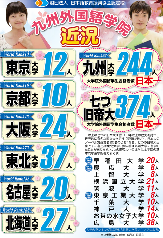 九州外国语学院自成立以来始终坚持以指导留学生考入日本七大旧帝国大学·大学院为最基本的升学指导方针。目前为止,已向七所旧帝国大学·大学院,东京大学,京都大学,大阪大学,名古屋大学,九州大学,东北大学,北海道大学输送了400多名的合格者。
