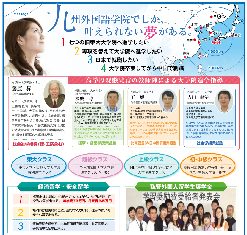 九州外国语学院作为大学·大学院升学教育的名校,热烈欢迎各国大学·大学院的优秀毕业生,在日本接受更高层次的教育。