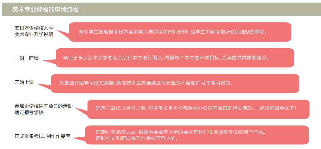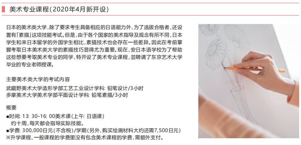 日本的美术类大学,除了要求考生具备相应的日语能力外,为了选拔合格者,还设置有「素描」这项技能考试。但是,由于各个国家的美术指导及观念有所不同,日本学生和来日本留学的外国学生相比,素描技术也会存在一些差异。因此在考前掌握考取日本美术类大学的素描技巧显得尤为重要。现在,安日本语学校为了帮助这些想要考取美术专业的同学,特开设了美术专业课程,並聘请了东京艺术大学毕业的专业老师授课。
