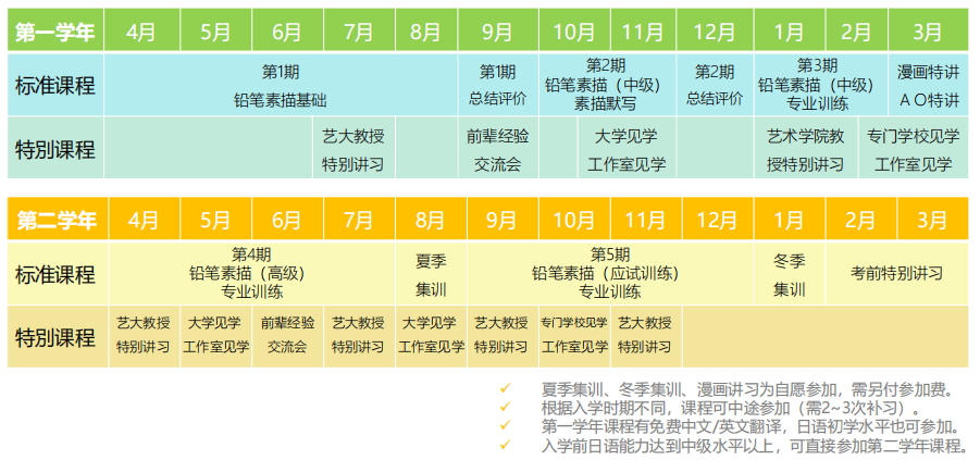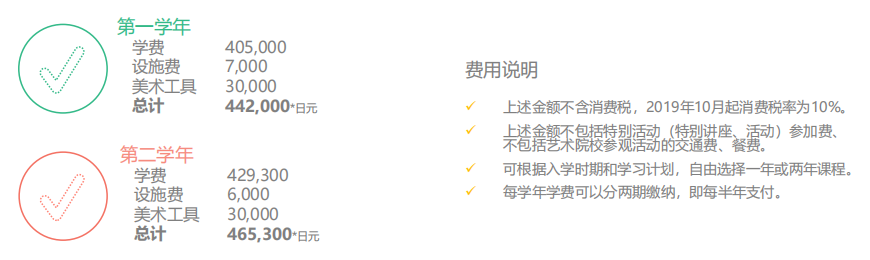 注:学费可能随当期实际授课次数略有变动、艺术课程学费可以半年一交。 画具组合入学时仅缴纳一次即可。部分特别讲习、校外活动需单独缴纳。 上述金额已含税(现行消费税率为10%),21年4月以后入学者按上述学费执行。 |