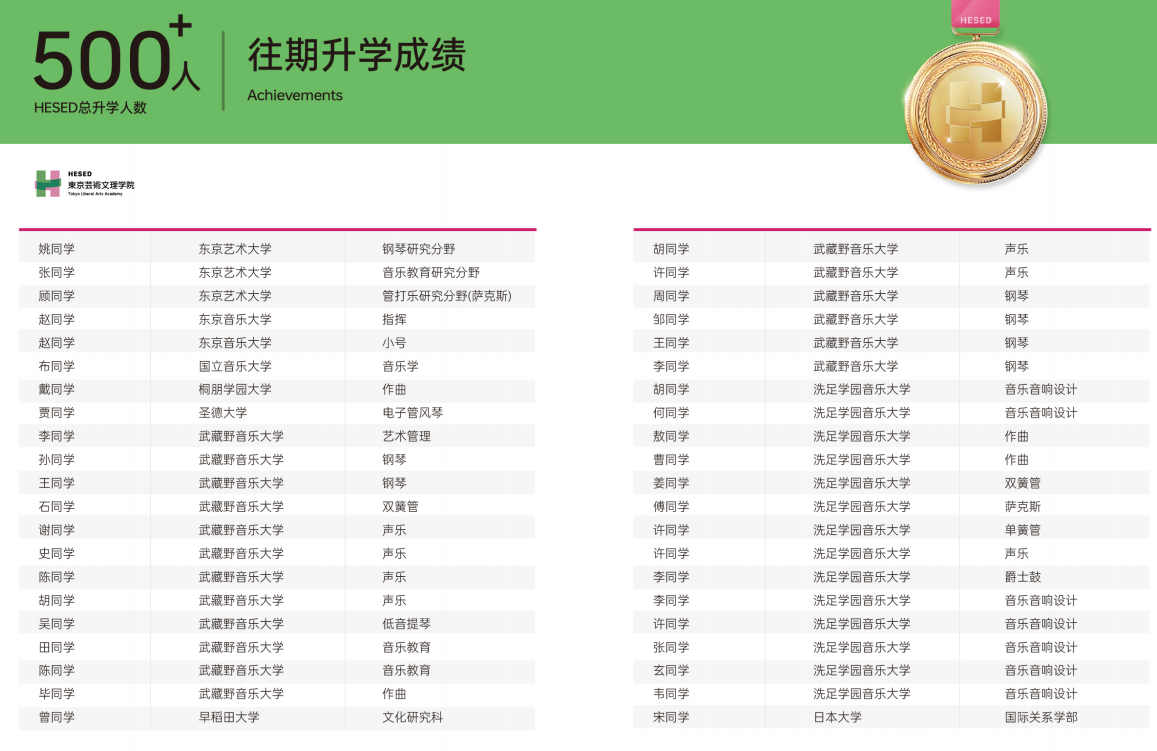 从入学日起,半年内顺利考入「早稻田大学」、「庆应义塾大学」、「上智大学」、「学习院大学」、「明治大学」、「青山学院大学」、「立教大学」、「中央大学」、「法政大学」、「桐朋学园大学」、「昭和音乐大学」、「东京音乐大学」、「国立音乐大学」以及其余国公立大学者*(按合格发表日期为准)