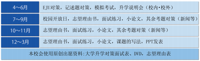 同时提供极优惠价格的校内EJU辅导课程,毎年3月开始的升学辅导课程,EJU备考(全年,费用另交,非强制性)与多家知名私塾合作提供完善的教育体系;
