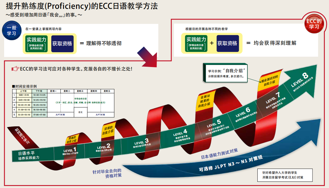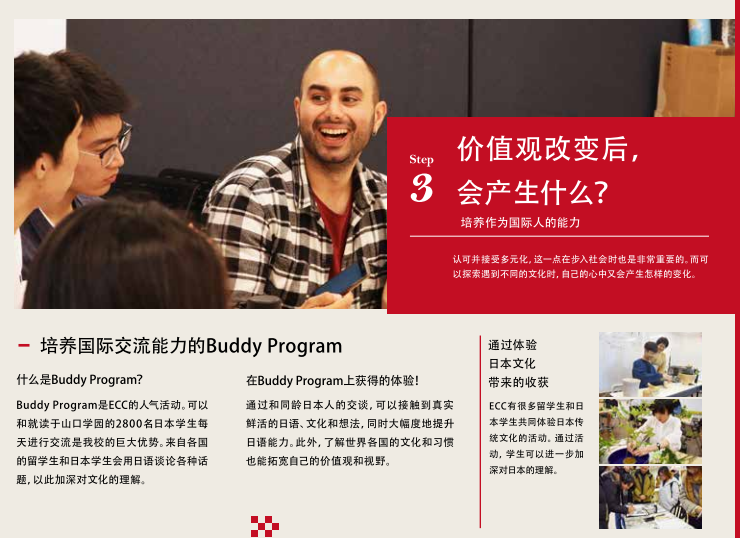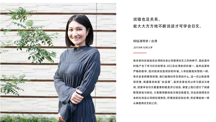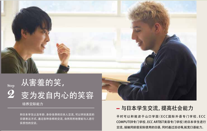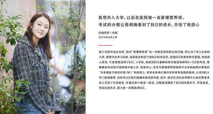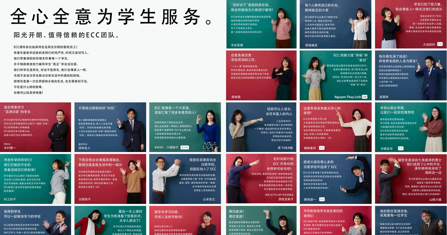 为留学生指引前方道路的是身为教职员的我们。离开家人,只身一人来到异国他乡虽然内心充满了不安,但今天,你仍然带着梦想坐在课堂上听讲看到你和朋友们欢笑嬉闹,老师会感到欣慰。而看到你那烦恼的背影时,老师又会想紧紧地拥抱你,加油。老师能说的只有这两个字。但是,老师会尽全力教导日语,决不会放弃你。因为老师知道,你把一生中非常宝贵的时光交给了ECC也知道你是在下定决心后来到ECC的。所以,虽然艰苦,但是老师和你并肩前行
