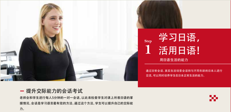 老师会和学生进行每人5分钟的一对一会话,以此来检查学生对课上所教日语的掌握情况。会话是学习语言最有效的方法。通过这个方法,学生可以提升自己的交际能力。