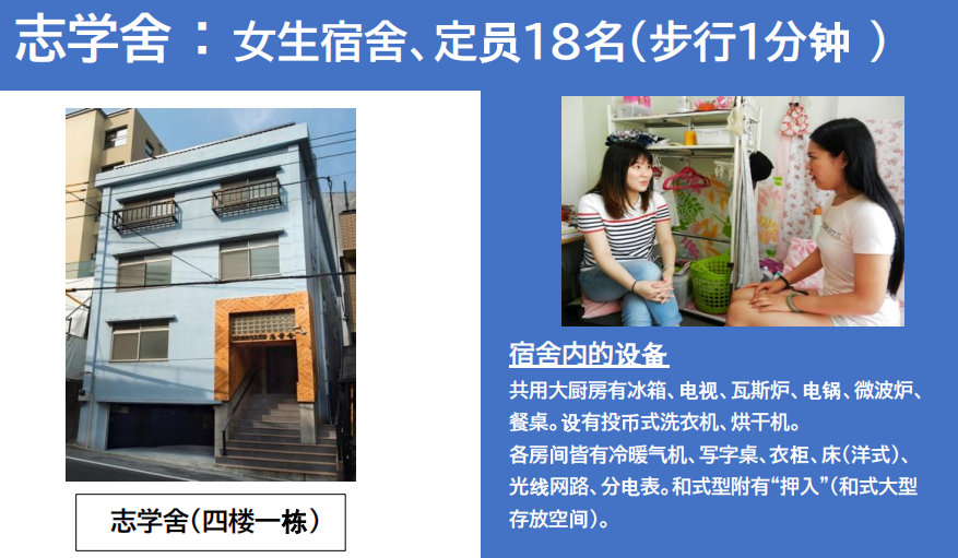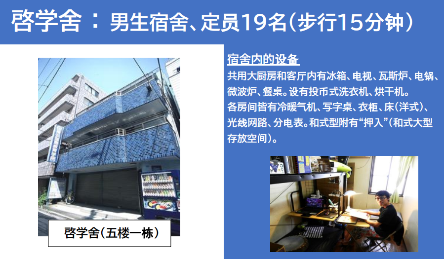 注:入寮费,保证金,保险只有第一次入住交纳。学校宿舍步行1-20分钟,但数量少