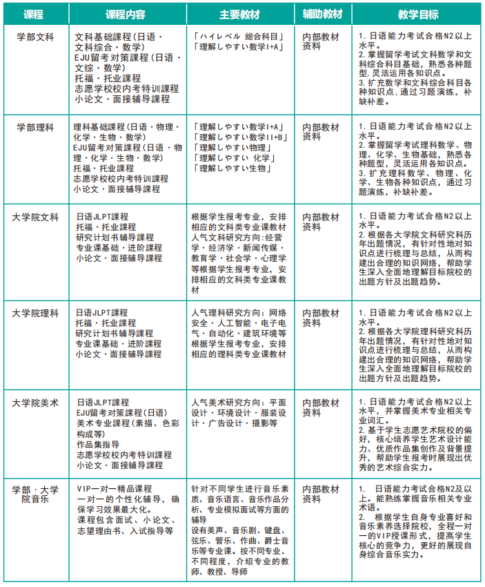 理科基础课程(日语+理化生+数学)+EJU留考对策课程(日语+理化生+数学)+托福/托业预备课程/高分对策课程+志愿学校校内考特训课程+小论文/面试辅导课程 |