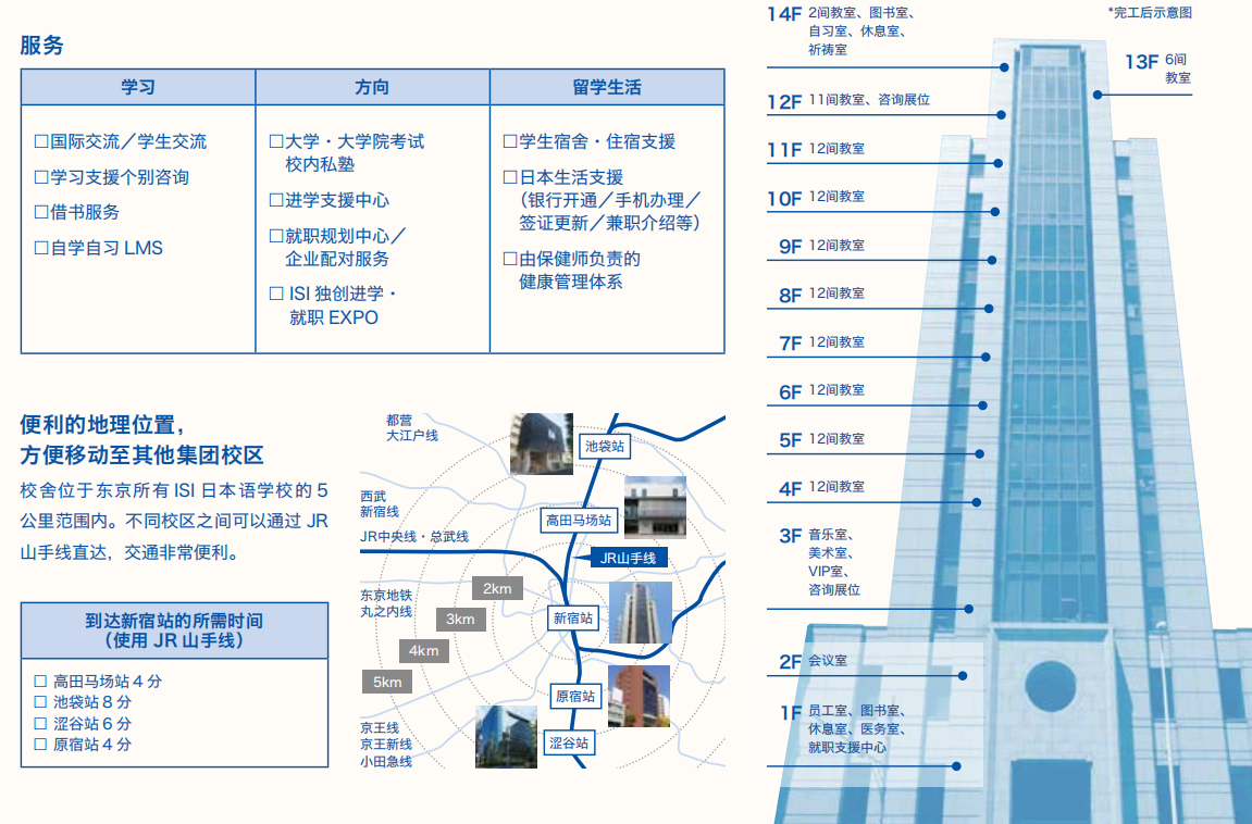 目前ISI于东京设有2所学校(高田马场校和池袋校)及京都设立一个新的分校。ISI每年为2000名来自世界各地的留学生们提供适合他们学习日语和日本文化的环境。