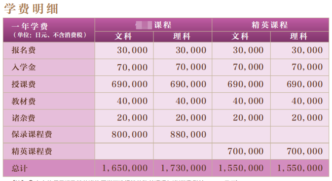 大学院精英班(日本前100名大学):文科60万日元/年,理工科70万日元/年